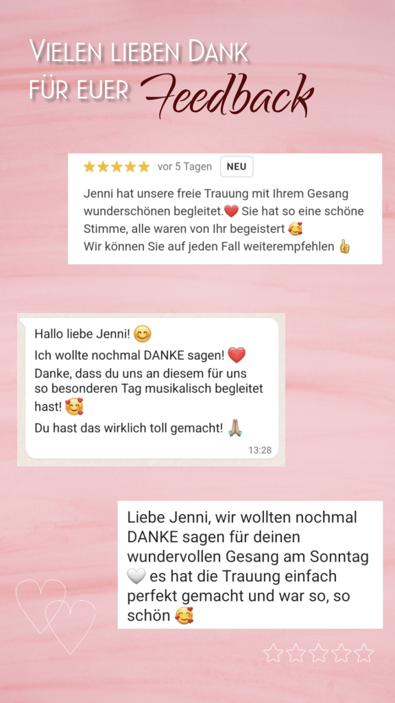 Vielen vielen Dank nochmal für die musikalische Begleitung während unserer Trauung! Es war wirklich wunderschön und du hast uns uns unsere Gäste mit deiner Stimme sehr berührt. Ich kann Jenni absolut empfehlen und würde sie immer wieder buchen!